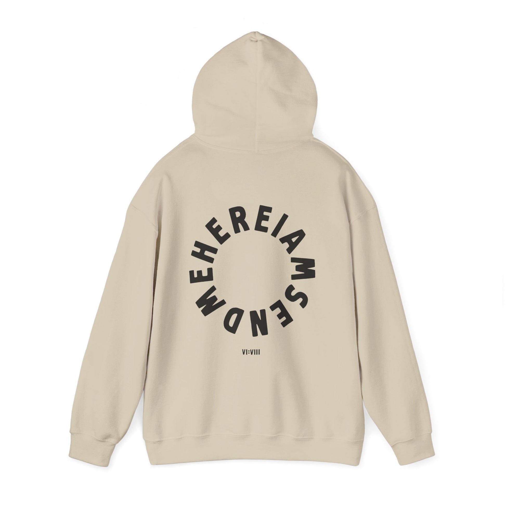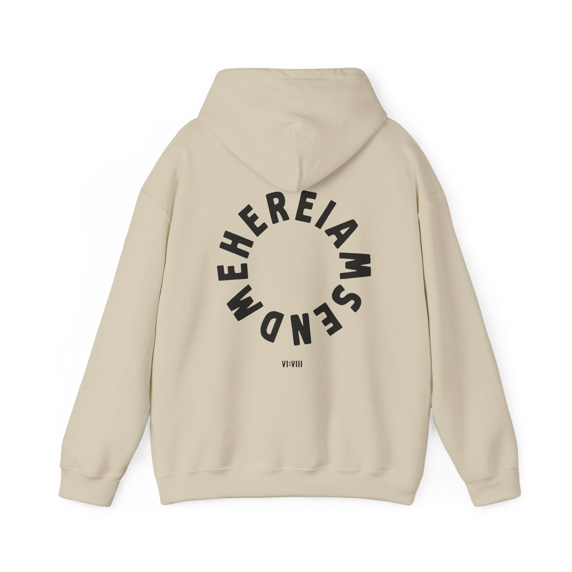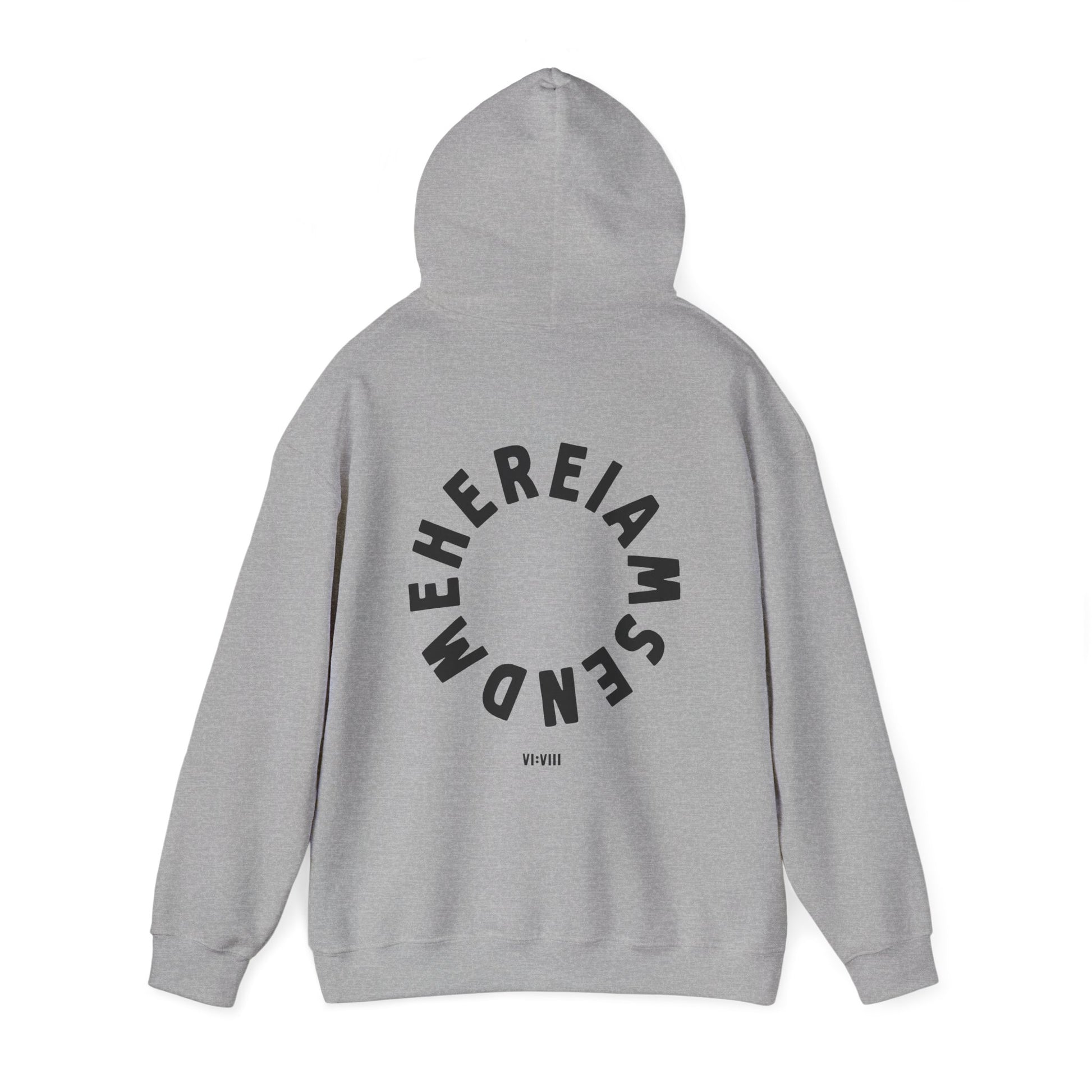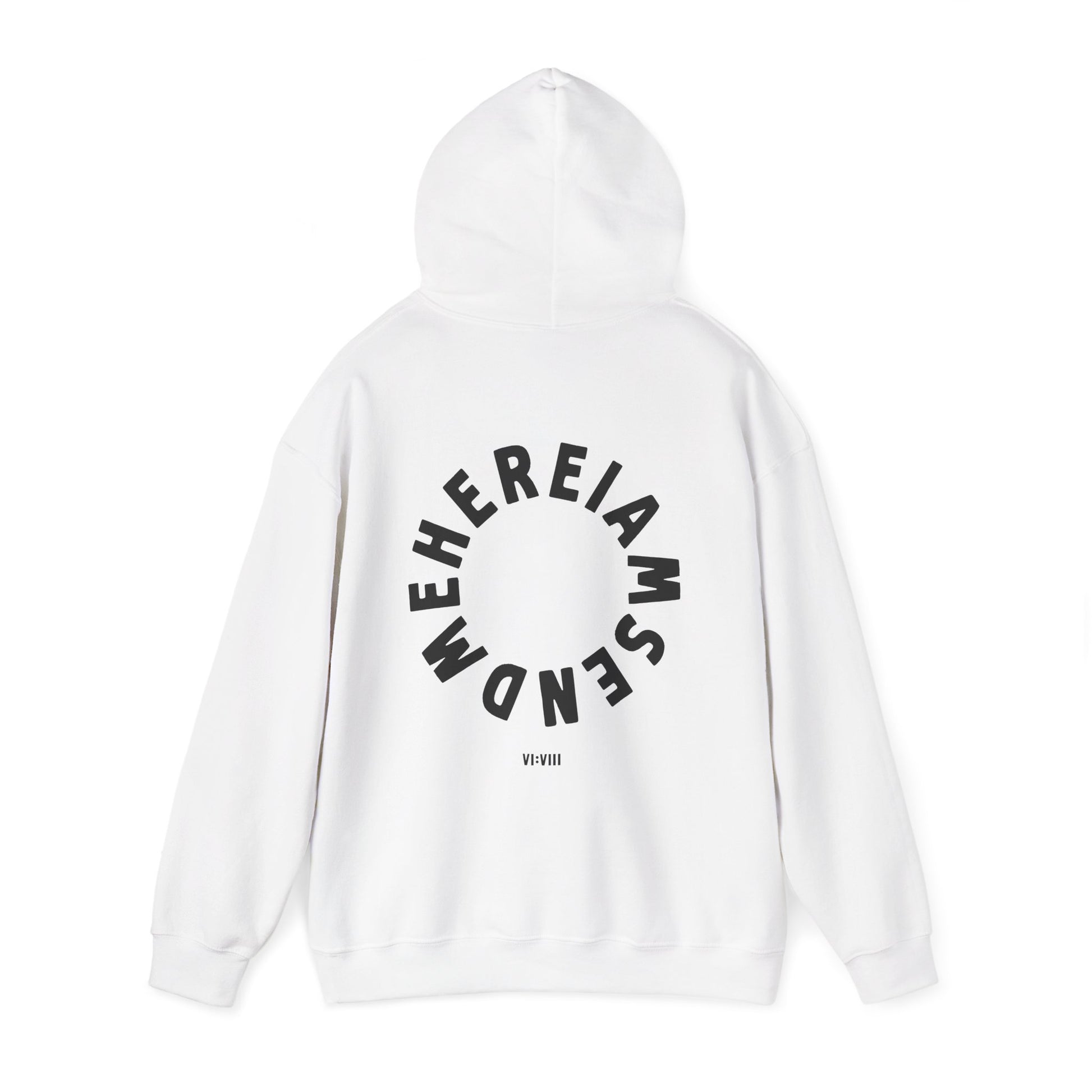 This meaningful hoodie features “6:8” boldly on the front - a simple yet powerful nod to Isaiah 6:8. On the back, the words “Here I am. Send me.” form a circular design, symbolizing readiness and devotion to God’s calling. A minimal and faith-filled design that speaks volumes without saying much.